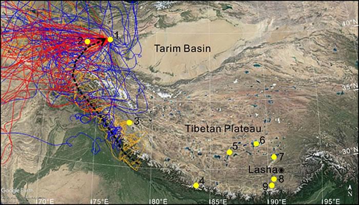 根据现代亚洲铁杉属生境,喀什地区在全新世时期不可能有铁杉属生长,其很可能是从青藏高原东南缘传播而来。为了追溯地层中铁杉属花粉的来源,研究人员利用拉格朗日混合单粒子轨道模型(HYSPLIT 4),对铁杉花期时段(3、4、5月)研究地点的气流后向轨迹进行了模拟。模拟轨迹显示现代气候条件下,存在春季时段从青藏高原东南缘到喀什地区的气流轨迹(图2)。这表明在全新世时期,季风气流可以将青藏高原东南缘的铁杉花粉带到帕米尔高原东部的喀什地区,其所经过的路径可视为古季风移动路径的相似型之一。
