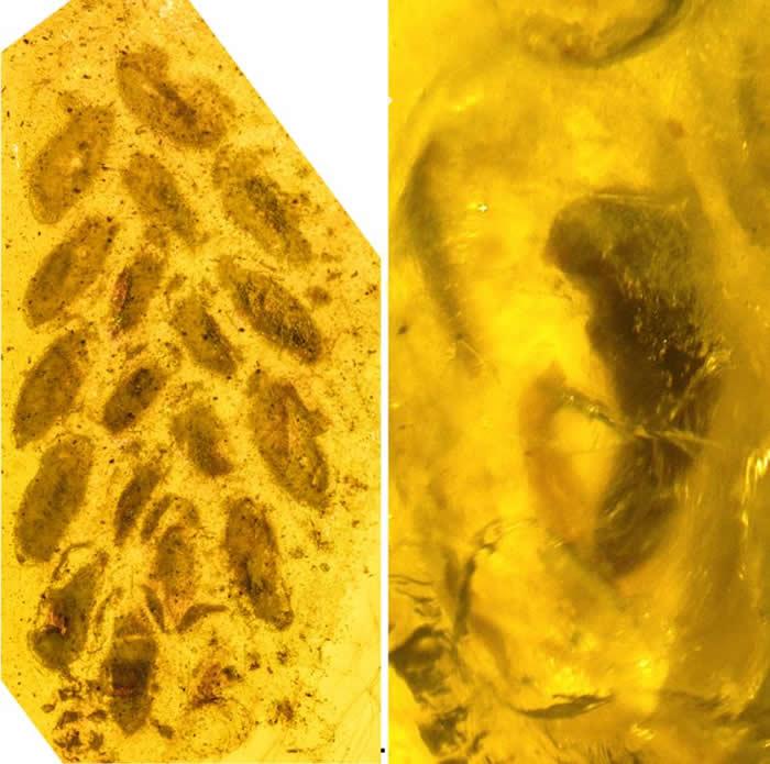 第三种卵团就像一串串葡萄,三个标本分别包含有28个、18个和22个分离良好的卵。椭圆形卵的长轴为1至1.7毫米。所有三个琥珀中的卵都是薄片状排列,卵以长轴彼此远离的形式形成一个人字样的图案。一些保存较好的卵可以观察到胚胎,但胚胎里面的腿或头部还没发育得很好,这表明其可能只是处于胚胎的早期阶段,其整体的形态与鞘翅类的卵相似。