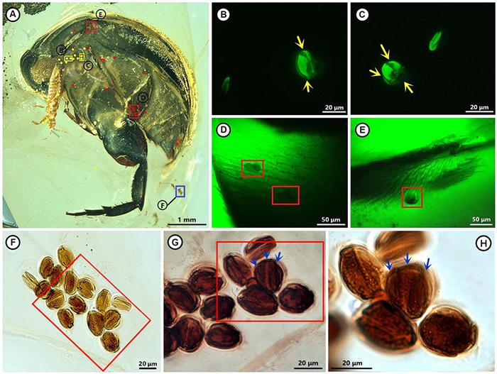 研究团队对琥珀标本精细打磨处理后,利用激光共聚焦显微镜和高倍光学显微镜的观察,发现花蚤的腹部、鞘翅和身体附近保存了至少62枚花粉颗粒,并确定了这些花粉属于典型的三沟型花粉。三沟型花粉指每个花粉颗粒上具三条辐射排列的沟,这也是真双子叶植物的重要鉴定特征。琥珀中这些花粉个体较大,表面有复杂纹饰,部分颗粒形成花粉团,揭示了早期被子植物虫媒花的花粉特征。