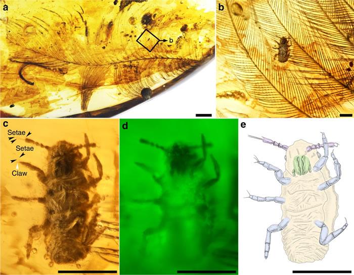 这项研究由中国首都师范大学任东,首都师范大学客座教授、美国史密森学会国家自然历史博物馆史宗冈,首都师范大学高太平和同事们共同完成。他们分析了两块约9900万年前缅甸北部克钦地区的琥珀化石,化石中保存着两根恐龙羽毛和10种类似虱子的小昆虫,其中一根羽毛甚至有被啃咬的迹象。