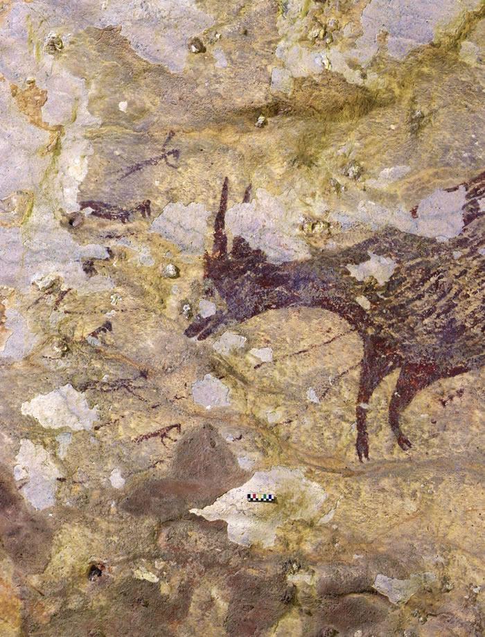 昆士兰省葛里菲斯大学的考古学家布鲁姆(Adam Brumm)表示,该幅两年前发现的约4.5米阔旧石器时代晚期壁画,绘有苏拉威西岛特有的水牛和野猪;在它们旁边,有数个较小、有尾巴和长鼻子似人的生物图案,这些半人兽生物拿着长矛,并用绳子绑住水牛。
