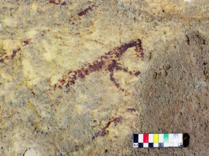 印尼苏拉威西岛洞穴发现4.4万年前叙述故事的壁画 半人半兽的生物手持矛猎杀动物(Credit: Ratno Sardi)