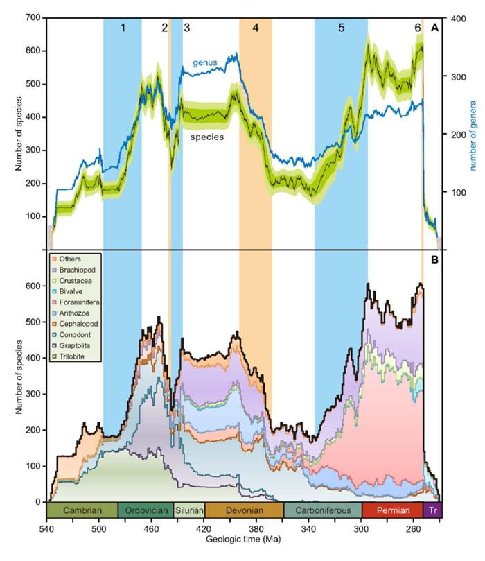 为了建立古生代(约5.4亿年-2.4亿年,相当于寒武纪至三叠纪早期)海洋生物多样性曲线,樊隽轩等收集了大量的地层剖面和化石记录,从中遴选了3112个地层剖面、11268个海洋化石物种的26万化石数据。