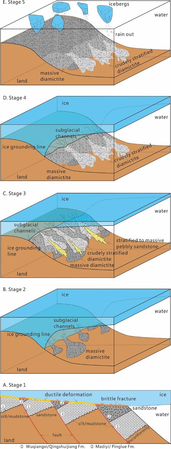 研究发现,其沉积过程可分为5个阶段:第1阶段记录了冰盖与下伏地层的相互作用,下文提到的冰川构造变形即发生在这一阶段;第2-4阶段代表了冰盖的前进-后退-前进过程,第5阶段为最终冰消期。亦即是说铁丝坳/东山峰组沉积记录了至少两次冰川进退过程,说明该时期的冰盖是不稳定的。