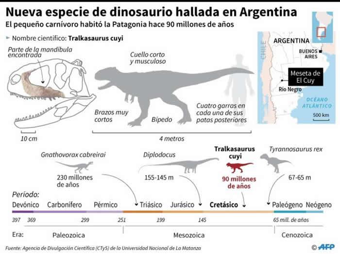 阿根廷巴塔哥尼亚发现9000万年前新食肉恐龙物种化石“Tralkasaurus cuyi”(Museo Argentino de Ciencias Naturales / AFP)
