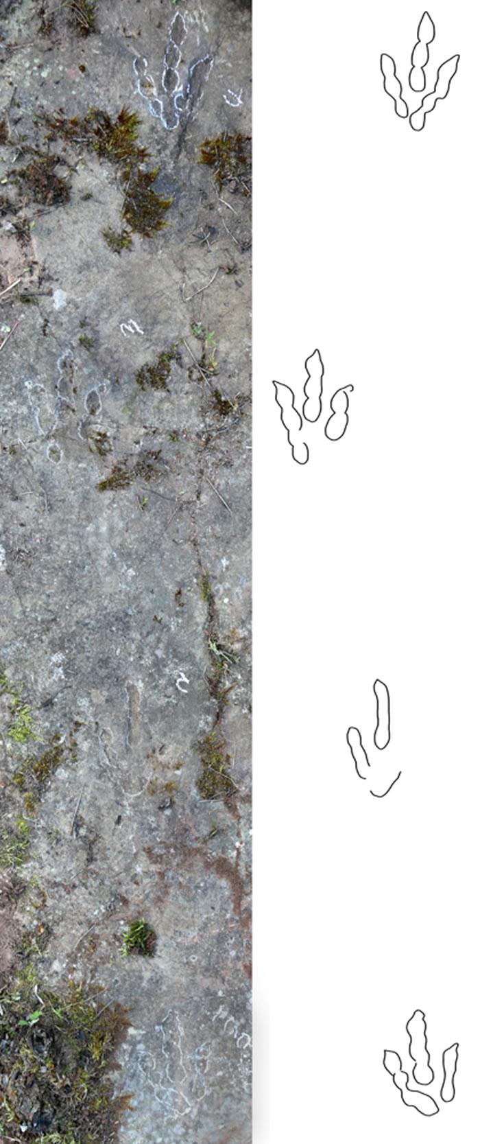 本次共发现32个三趾型足迹,其中31个足迹为肉食性的兽脚类恐龙所留,长度在14至19厘米之间,它们组成了4条行迹。这些足迹大部分保存良好,形态完整,可观察到趾垫和趾尖。