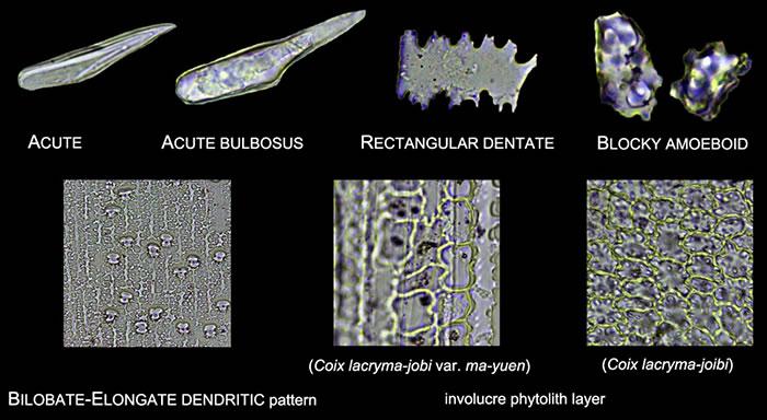 研究还发现,薏苡的外壳中含有大量的植硅体,这些植硅体互相链接在一起组成厚层的硅质外壳(involucre phytolith layer),然而具有坚硬外壳的薏苡(通常用于装饰)和较脆弱外壳的薏苡(通常用以当做粮食)其外壳中产生不同类型的植硅体:坚硬外壳的薏苡(装饰用)中植硅体形态一致,为具有瘤状突起的不规则球形(Blocky amoeboid),这些植硅体之间链接紧密,组成了坚硬不易碎的外壳(需要用锤砸开);较脆弱外壳的薏苡(食用)中植硅体则为常见的哑铃型和棒型的组合,虽然有些植硅体形态因为挤压而变形,但这些植硅体之间的链接并不坚固,因此表现出外壳较脆弱(用手指即可碾碎)。由于外壳的硬度是薏苡驯化的一个重要指标,研究认为薏苡外壳中植硅体的这种差异能够应用于探讨薏苡的驯化过程。