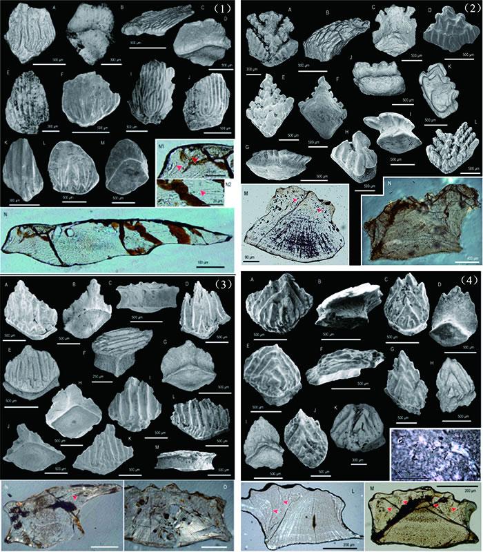 新疆柯坪—巴楚地区早志留世软骨鱼类四个新属:(1) 塔克拉玛干鱼Taklamakanolepis,(2) 铁力克瓦铁鱼Tielikewatielepis, (3) 小海子鱼Xiaohaizilepis, (4) 袁氏鱼Yuanolepis