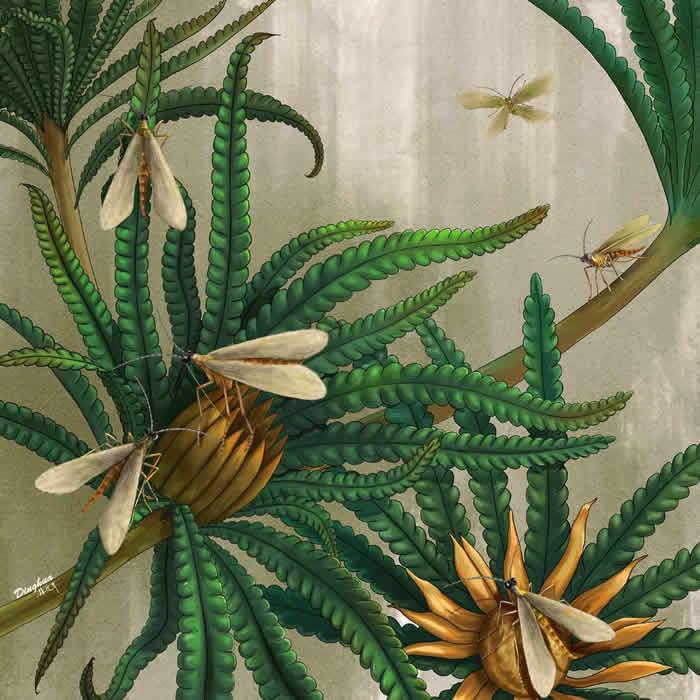 一亿年前的中生代,有一类特殊的长翅目昆虫名叫中生蝎蛉,它们具有特化的、明显伸长的口器,被认为是裸子植物的重要传粉者。中生蝎蛉广泛分布于我国侏罗纪燕辽生物群、白垩纪热河生物群和缅甸琥珀生物群。