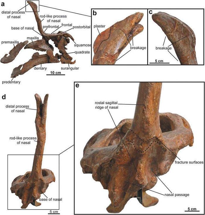 棘鼻青岛龙头骨,显示其特殊的“棘鼻”状头饰以及鼻骨根部断裂处