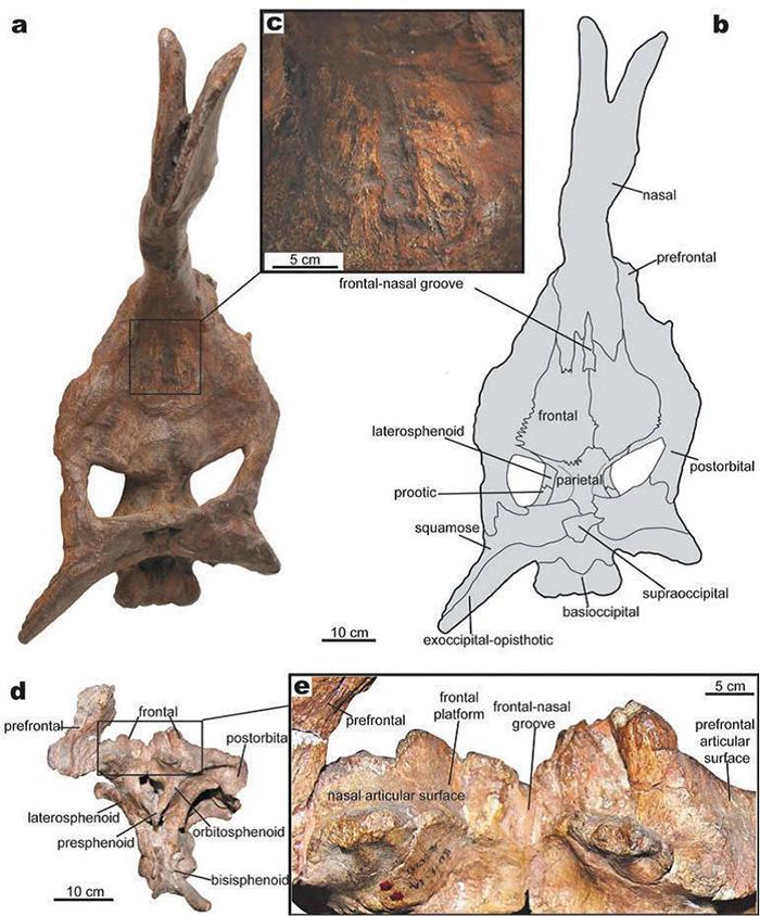 棘鼻青岛龙正型和副型头骨,显示鼻骨、额骨间的窄沟状结构