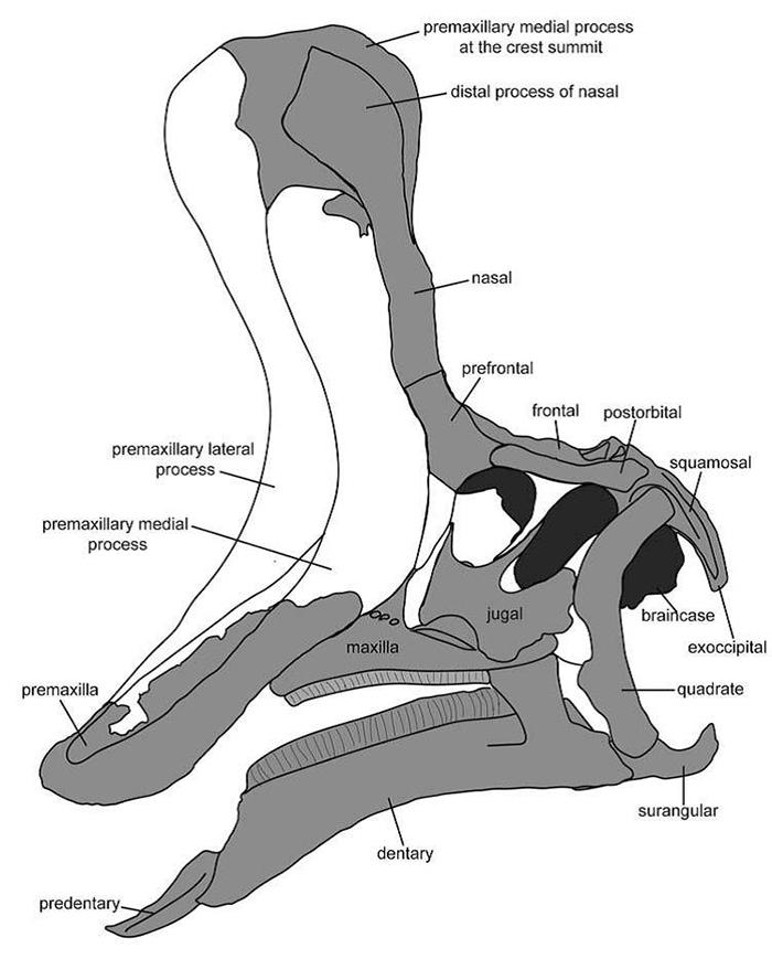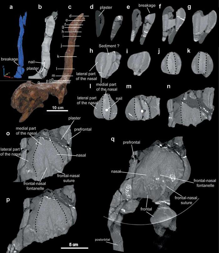 此次研究还发现了棘鼻青岛龙鼻骨的另外一个形态学特征,在鼻骨根部也分成两支,有一个窄条状结构夹于其中,无论外部观察还是CT扫描均显示这一结构与周围的鼻骨和额骨均有明显界限,且密度也有所不同。CT扫描还显示其矢状面向腹侧变小,近似于半圆形,其尾部与棘鼻青岛龙更年轻的副型头骨的两个额骨的鼻骨关节面中间的裂隙相似,认为这一结构为一个被沉积物填充的窄沟,是从鸭嘴龙超科基干类群和一些较原始的赖氏龙亚科成员所具有的额骨鼻骨囟(frontal-nasal fontanelle)演化而来,而并非此前学者认为的额骨前突。