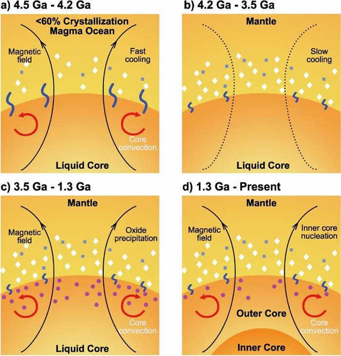 地核早期演化模型。白色菱形为布里奇曼石,蓝色方块代表铁方镁石,紫色圆点代表地核析出物。黑色箭头代表磁场。红色箭头代表地核的对流。蓝色s型曲线代表地核的冷却速率。(a)地球早期到42亿年,岩浆洋结晶程度小于60%,岩浆洋快速冷却,对应为地核快速降温区间。快速降温释放的热能驱动对流产生磁场。(b)42到35亿年,岩浆洋结晶程度大于60%,地核开始缓慢降温,可能有较弱磁场。(c)35到13亿年,以氧化镁为主的硅酸盐或氧化物析出开始,地磁场重新转强。在之后历史演化过程中,析出速率逐渐降低,地磁场强度逐渐下降(d)最后在13亿年,内核开始形成,地核发电机获得了新的能量源,地磁场强度再次变强。以上演化步骤与古地磁场强度演化能够一一对应