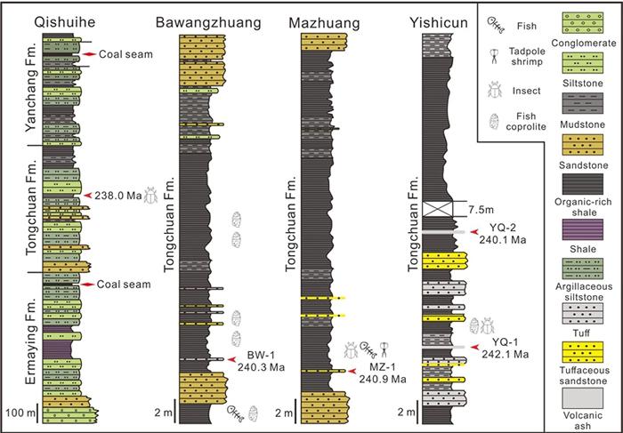 研究团队在鄂尔多斯盆地南缘三条富含油页岩和凝灰岩的剖面(霸王庄、马庄和衣食村)进行了高精度的地层学、沉积学和古生物学研究,并对剖面中的火山灰、凝灰岩和凝灰质砂岩进行了锆石铀-铅(U-Pb)定年,最终将湖相油页岩底部年龄卡定在242Ma左右,归于中三叠统铜川组。这套油页岩是二叠纪末大灭绝之后已知最早的深湖相沉积,比之前的记录向前推进了500万年。