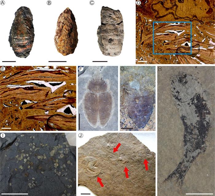 剖面产出的各类代表性化石。A-C, 鱼粪;D-E,鱼粪切片;F和G,甲虫;H,鱼;I,介形虫;J,鲎虫