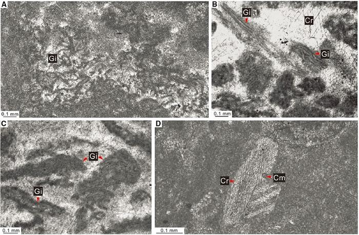 安徽南部北贡剖面早奥陶世特马豆克阶仑山组的叠层石的微相照片. A) 相互缠绕的钙质微生物丝状体(Gi); B) 保存良好的长条状微生物丝状体; C) 缠结呈凝块状的钙质微生物丝状体; D) 带有生物钻孔(Cm)的棘皮动物碎片(Cr)