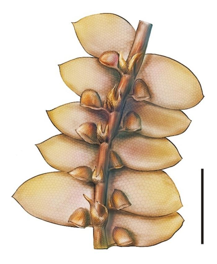光萼苔目是新生代琥珀化石中最常见的苔类植物,但相比而言在白垩纪琥珀中的记录很少,通常由小碎片组成,而不是完整的植物。迄今为止,缅甸白垩纪琥珀中仅报道有多囊苔科、扁萼苔科和耳叶苔科4属6种等少数种类。当前深裂耳叶苔的发现,代表缅甸白垩纪琥珀生物群耳叶苔科的化石种的新进展,为进一步研究光萼苔目耳叶苔科在白垩纪中期的辐射和多样性演化积累了化石证据。