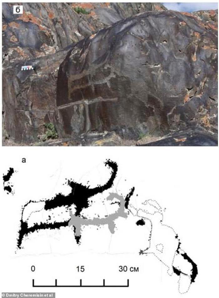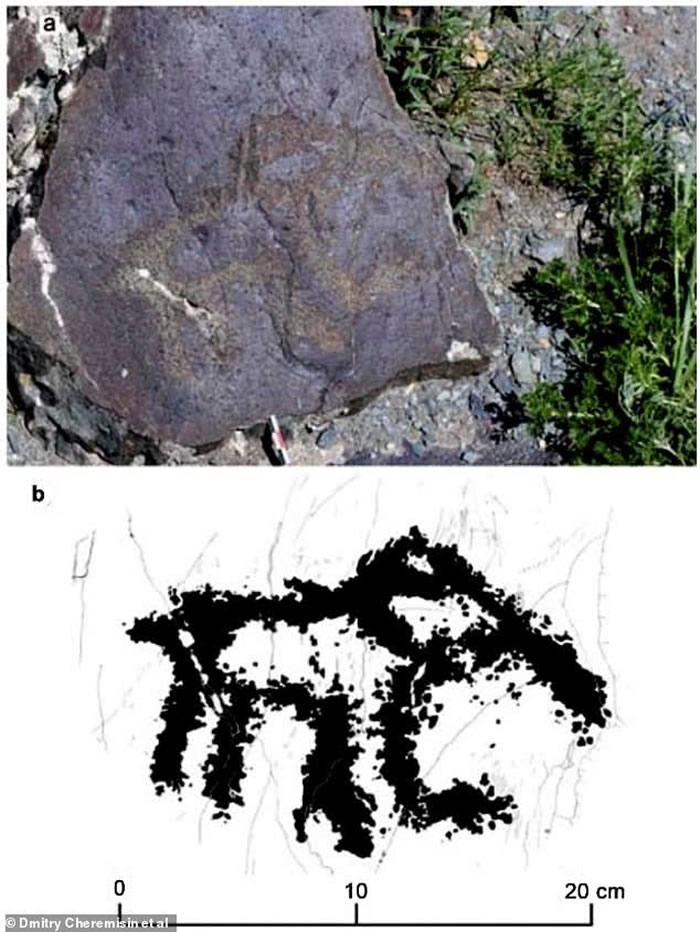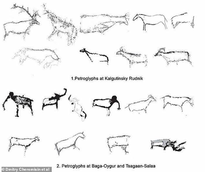 据《西伯利亚时报》报道,早在上个世纪九十年代到二十一世纪初,考古工作者就在俄蒙边境山区发现了露天岩画,内容主要是各种动物,当时考古工作者认为这些岩画是距今8000年前的古人类所作。