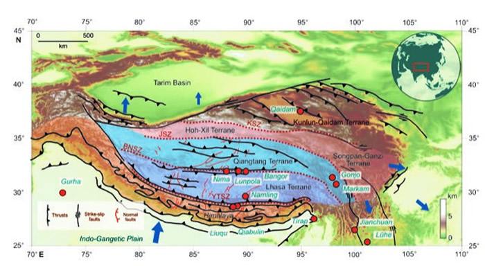 青藏高原构造简图。青藏高原是由不同的地块拼接而成,各地块的形成过程不同而又有机地统一。红色圆点为本文涉及到的青藏高原及其邻近地区古海拔研究地点。