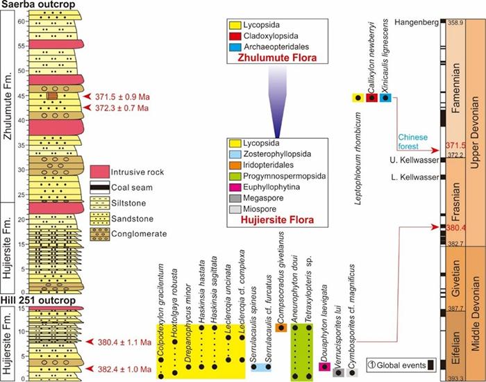 研究团队对萨尔巴剖面植物化石层进行了高精度的锆石铀-铅(U-Pb)定年,将朱鲁木特植物群的时代限定在弗拉期最早期(371.5 ± 0.9 Ma),与海相弗拉期-法门期界限(约372 Ma)同时或略晚于后者。该年代表明朱鲁木特植物群是我国目前已知最早的森林,该森林的形成时间与弗拉期—法门期界线一致。此外,研究团队还对251山剖面呼吉尔斯特植物群的同位素年代进行了重新处理和计算,获得了更为精确的年代,将该植物群限定在约382.4 Ma-380.4 Ma。