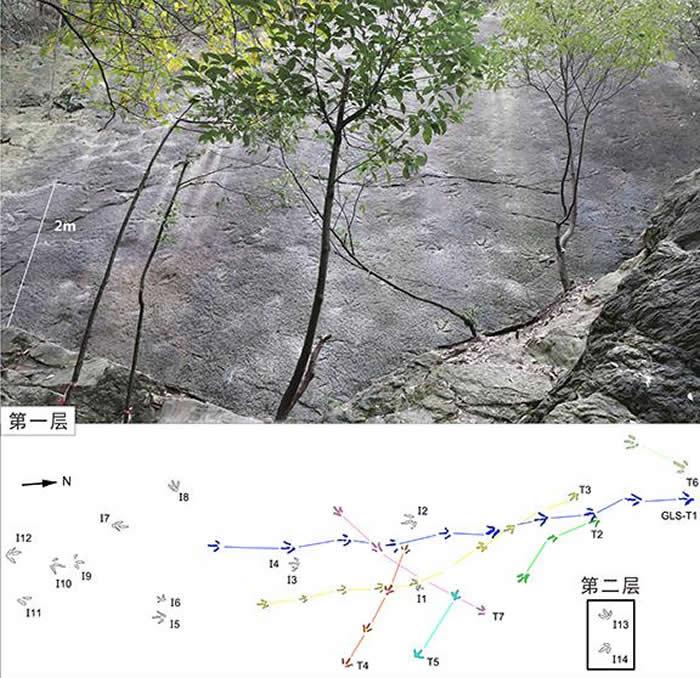 该足迹群位于两个相距大约3米的石英砂岩表面,共有46个三趾型兽脚类足迹。其中,第一层表面包含7条行迹(GLS-T1–T7)共计由32个足迹组成,另有12个孤立的足迹;第二层共计2个孤立的足迹。第一层7条行迹的足迹平均为24.1厘米,最大的足迹(GLS-T1–R1)长35厘米,最小的足迹(GLS-T3–L5)长16厘米。根据测量足迹的相对步幅长度,推测其为大中型兽脚类恐龙造迹而成,且当时“造迹者”正做小跑的步态。