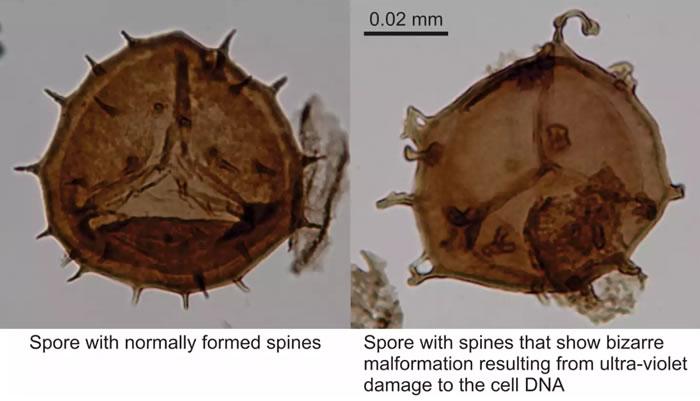 结果发现,许多孢子的颜色比预期的要深,表面上长出了不寻常的刺。据研究小组称,颜色的变化很可能是对紫外线辐射过量的保护反应。这种波长的辐射也可能破坏了孢子的DNA,引发了异常刺的生长。但是,那么如此破坏性的紫外线辐射是如何到达地球表面的呢?研究小组认为,臭氧的破坏是地球气候周期的一个自然部分,而不是强烈的火山喷发造成的异常。