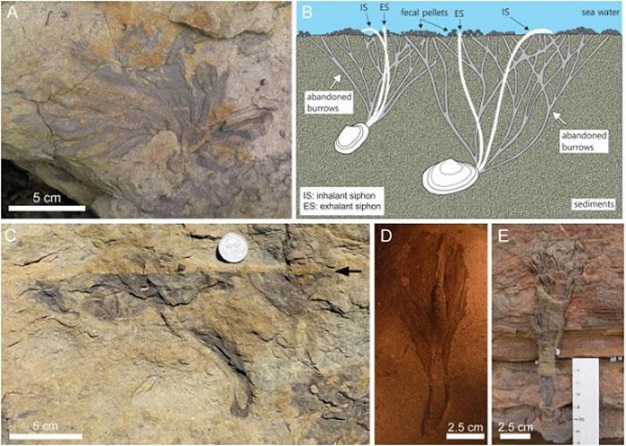 南悉尼盆地二叠纪乌拉尔阶Snapper Point组中遗迹化石Parahaentzschelinia isp.与现代樱蛤类双壳类Abra nitida潜穴行为及其造成遗迹对比;D, E为与相似遗迹属Rosselia Socialis的对比