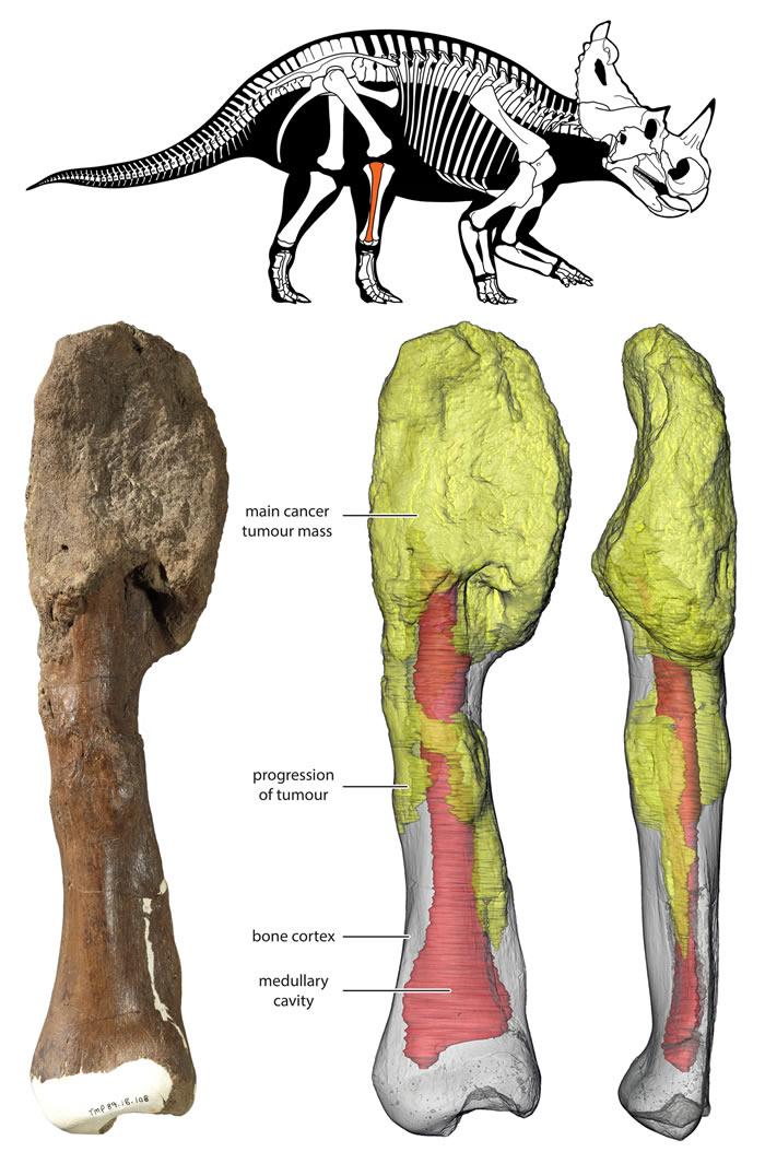 该恐龙化石是1989年在加拿大艾伯塔省的恐龙省立公园被发现的,它是一种生活在7600万年—7700万年前的有角恐龙。被诊断出恶性肿瘤的部位是恐龙的腓骨或小腿骨,因具有畸形的两端,最初曾被认为是骨折愈合后留下的痕迹。