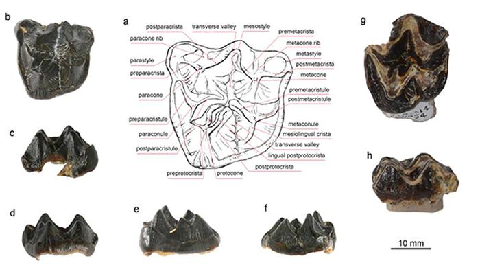 新疆准噶尔盆地北缘的石炭兽类,a-f 泽炭兽未定种(Elomeryx sp.), g-h 巴卡洛夫炭兽未定种(Bakalovia sp.) 王世骐供图