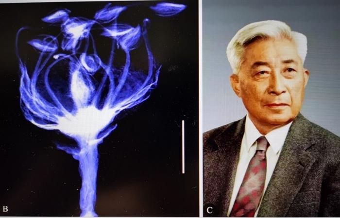 丁氏花与丁石孙先生. 左图是丁氏花在微CT中的图像,右图是前北京大学校长、著名数学家丁石孙先生