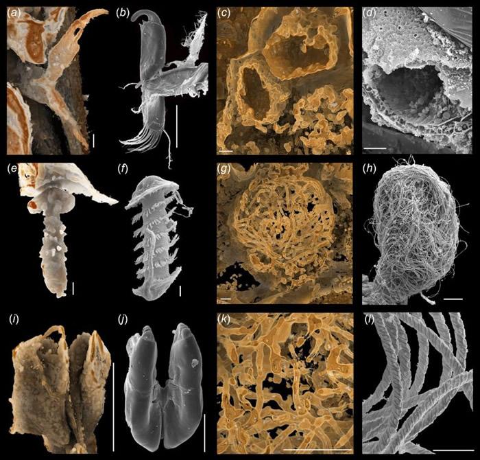 介形虫有性生殖器官对比图(左为化石,右为现代类群):a和b:抱握器;c和d:卵的横截面;e和f:精子泵;g和h:介形虫的精子;i和j:半阴茎;k和l:介形虫精子细节结构