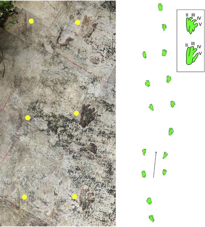 在幺铺足迹点与双桨迹同层的岩石上,研究团队还发现一种新的足迹类型。不同于双桨迹,新足迹类型为用半脚掌-全脚掌触地行走的四趾型足迹,拥有完整的趾痕和掌痕,类似于四足动物在陆地正常行走留下的足迹。“足迹较长且有着清晰的趾痕,显示出足趾粗壮。行迹整体较宽,足迹对称且相对于行迹中线外转,是典型的拥有水下游泳或海底行走习性的四足动物所留下。”邢立达描述。