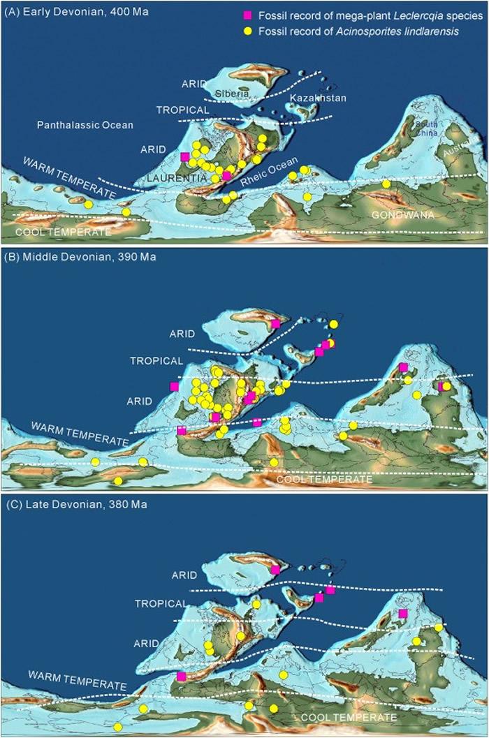 莱氏蕨在泥盆纪不同时期的时空分布模式