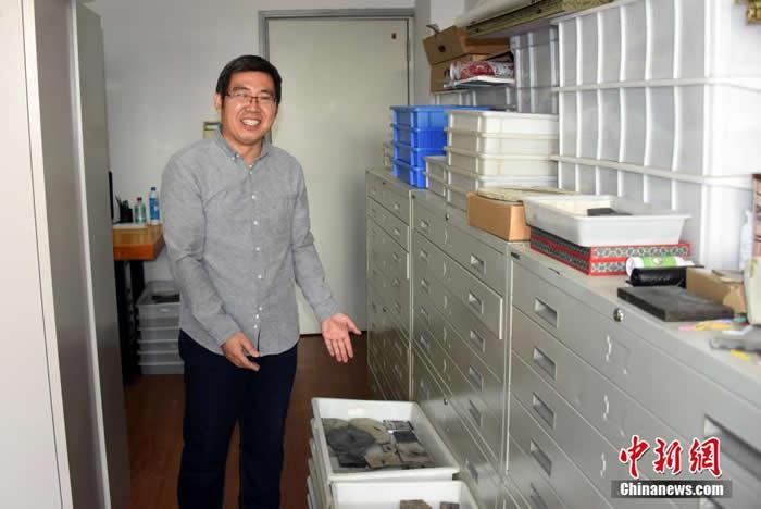 10月26日,中国科学院古脊椎动物与古人类研究所徐光辉研究员介绍他办公室中用于科学研究的古生物化石标本,这些探秘远古时期古生物如何演化的丰富化石标本“藏品”,均是科研人员跋山涉水从偏远地区采集而来。徐光辉最新完成的一项古生物研究成果,就是在云南罗平发现世界上迄今所知最古老的疣齿鱼科鱼类化石,命名为“云南暴鱼”。