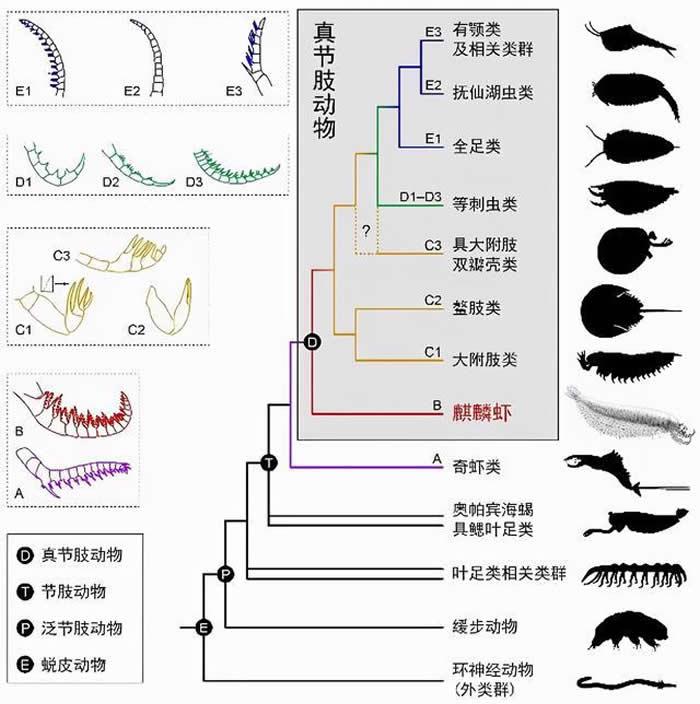 那么,麒麟虾在节肢动物的演化过程中处在哪个位置?研究人员通过谱系发生重建,计算反演出早期节肢动物演化关系和附肢形态转变的新模型。