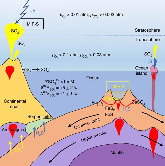 最后,作者构建了早期地球的S循环模型:(1)早期地球由于Theia的撞击导致板块构造自4.51 Ga开启;(2)在接下来的600 Ma期间陆壳大规模生长并暴露于海平面之上,通过风化向海洋中输入营养物质,为产氧生物的诞生以及之后的氧化大气和富硫酸盐海洋形成创造了条件;(3)富集O2和SO42-的海水交代洋壳导致其发生氧化,富含三价Fe,洋壳的持续俯冲导致地幔尤其是上地幔的Fe3+/ΣFe持续升高;(4)当氧化的富集SO42-的地幔楔形成后,陆地火山喷气逐渐由原来的以H2S为主转变成以SO2为主;(5)剧烈的火山喷发可以将SO2气体带至平流层,其中的氧分子可与SO2发生紫外线光解作用,形成S同位素的非质量分馏的特征。此外,有机质热还原硫酸盐的过程也可产生S同位素非质量分馏的信号。