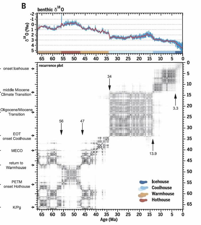 全球气候是一个复杂的动态系统,在万年到百万年尺度上,对准周期性的天文强迫有复杂的非线性响应。为研究CENOGRID的时域特征,研究团队进行了重现分析(recurrence analysis, 也称递归分析)。重现分析可以揭示系统的非线性动力学过程,以及非线性相互作用信息,重现图是对时间序列的内部结构及可预测性的可视化。