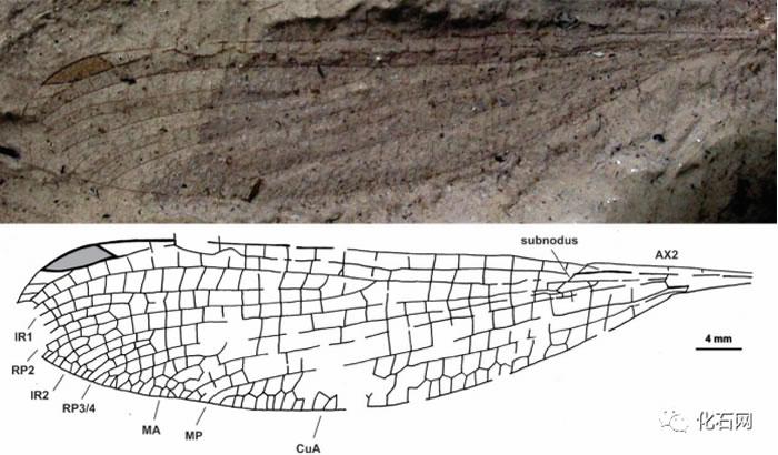 马拉多纳自由蟌(Librelula maradoniana)的化石标本和线条图