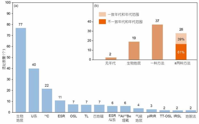 遗址测年方法总结。(a) 各测年方法在86处古人类遗址的应用情况。 (b) 遗址应用测年方法数分类,以及28处应用两种以上测年方法遗址的结果一致性和不一致性统计