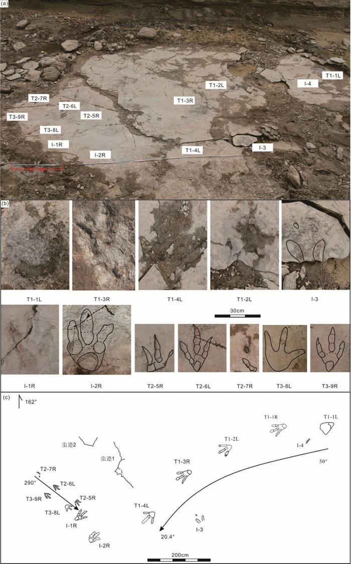 新发现的恐龙足迹保存在长约12 m宽约7 m,面积约80 m2的灰绿色细粒砂岩层面上,足迹化石层有上下两层,代表足迹化石的形成时间有先有后,说明恐龙在此地区持续生存了一段时间。