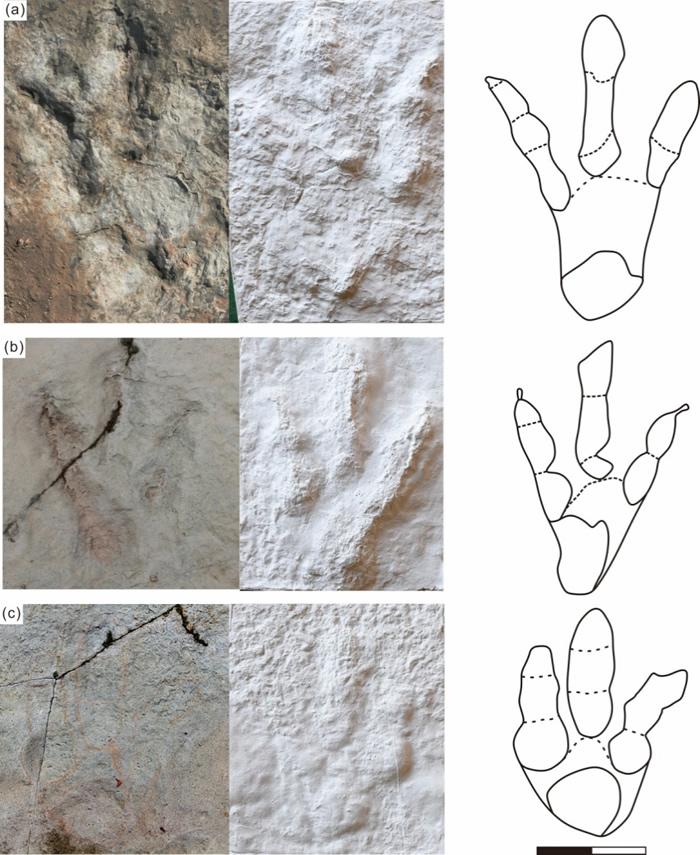 牛氏亚洲足迹(新种)野外化石照片、模型及线条图(比例尺为20 cm). (a) 正型; (b) 副型; (c) 归入标本(汪筱林团队供图)