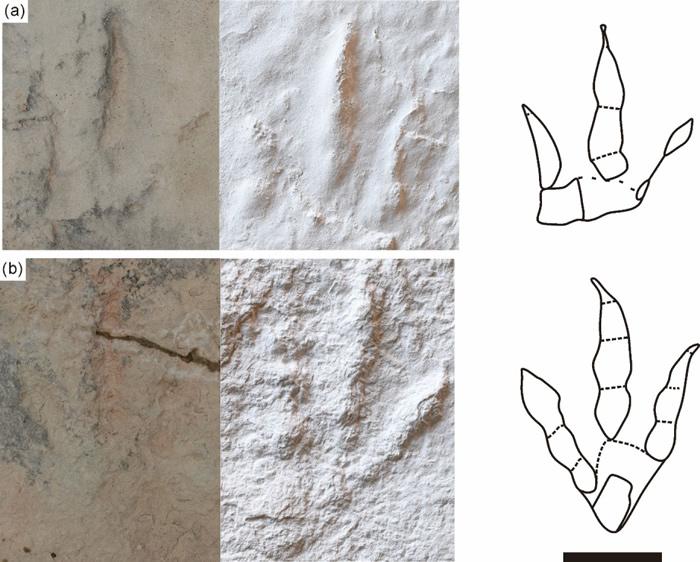 根据形态学研究,识别出两种兽脚类恐龙足迹,足迹化石呈三趾型,V字形,具有明显的脚跟印迹等特征均归入实雷龙足迹科亚洲足迹属。其中大型足迹建立一新种:牛氏亚洲足迹,足迹全长47~56 cm,宽31~42 cm,是亚洲足迹属中最大的类型,中型的归入已知的跟垫亚洲足迹。