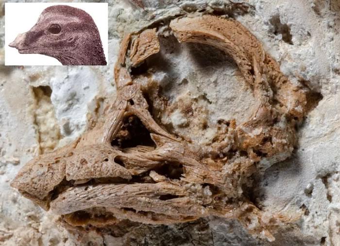 恐龙蛋化石中保存的泰坦巨龙幼年头骨(约3厘米长)及其复原图。(图片来自Kundrat et al.,2020)