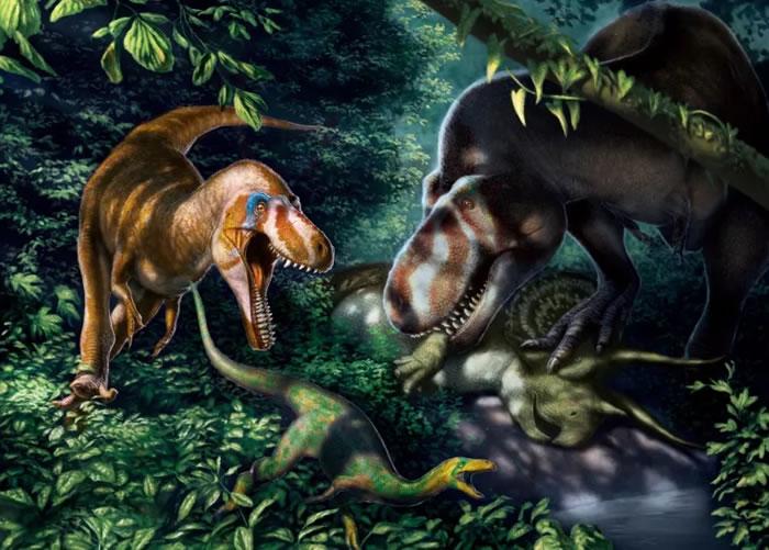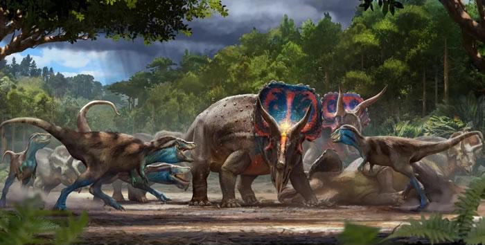 6千7百万年角龙与霸王龙的决斗场景复原图(图片版权:Anthony Hutchings)