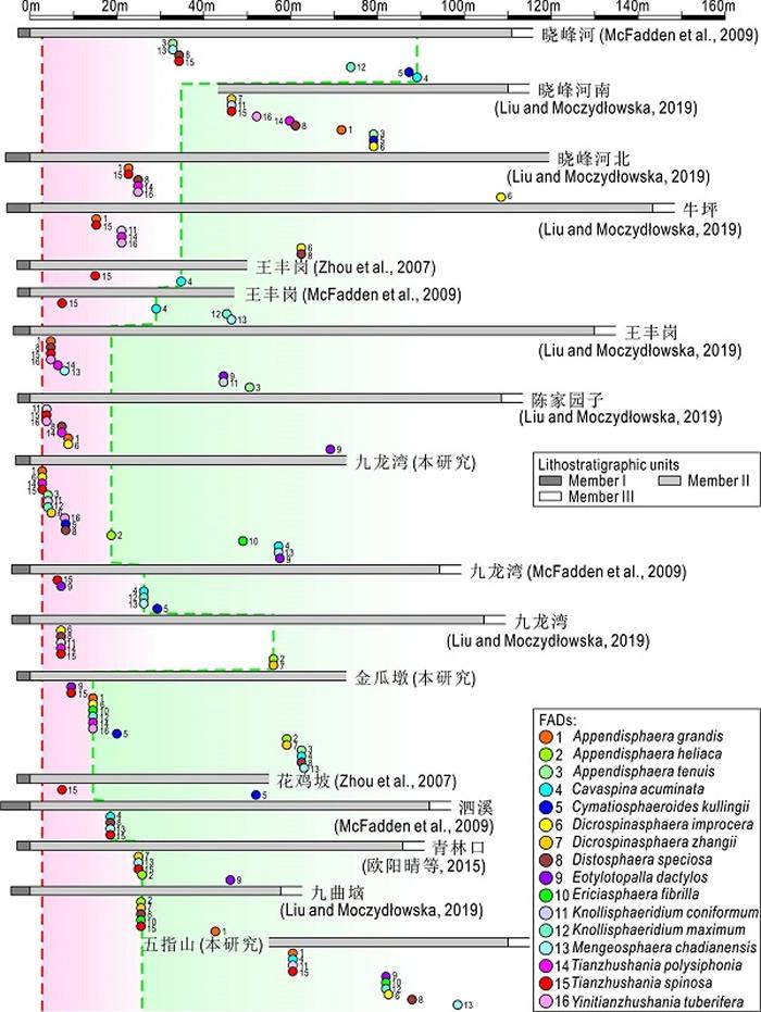首现层位之上,在九龙湾剖面盖帽白云岩之上20米之内的地层中共有多达21种刺饰疑源类出现,超过该剖面二段全部刺饰疑源类种数的一半(65.6%)。结合已发表的旋回地层学研究,这意味着仅仅在埃迪卡拉纪最初的一千万年内,刺饰疑源类发生了快速演化并已经具有了非常高的多样性。同时,本研究还整合了过去发表的大量剖面资料,指出过去使用“复合剖面”进行生物地层学研究存在的问题,并提出在华南具有较高生物地层学潜力的若干分子。