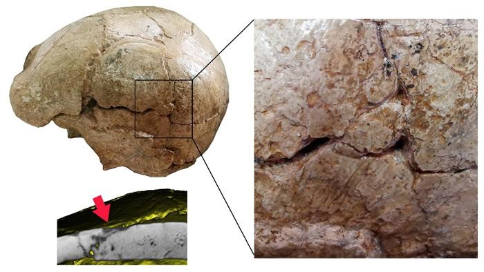 论文第一作者兼通讯作者吴秀杰研究员介绍说,最新研究发现,和县头盖骨表面有三种类型的异常痕迹:一是地层挤压导致的裂痕,主要表现为贯穿整个头盖骨内外表面,具有多个破裂的中心点及由此向四周呈放射状的长短不一的线性裂缝,裂缝边缘锋利,裂缝内部没有侵蚀陷窝或者地层沉积物,也没有人工打击或内侧边缘愈合痕迹。