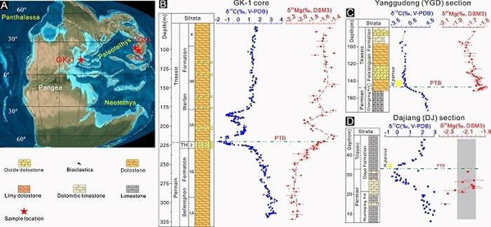 这一时期,古海洋环境发生了一系列剧变,包括海水升温、酸化、缺氧或硫化、大规模海退以及洋流循环受阻等,这些变化都是导致二叠纪末海洋生物大灭绝的可能因素,同时这些因素彼此之间又都具有一定的内在关联性。与其他常用来探讨古环境背景的铀、硫、铁等元素相比,镁在海洋中具有更高的含量,同时海洋中镁元素循环往往与碳-氧循环过程相伴,因而与一系列重大海陆变迁以及生命过程息息相关。