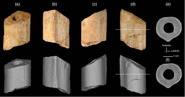 在华龙洞发现的古人类化石中,包括编号为HLD11、15、16的三件股骨。作为华龙洞古人类化石系列研究之一,研究团队对这三件股骨形态进行详细描述和对比。除传统的骨骼形态观测外,该研究还使用显微断层(micro-CT)扫描华龙洞股骨材料,获得特定位置80%和50%的断面,并计算了一系列生物力学参数,包括骨密质所占断面面积百分比(反映股骨轴向抗压力和张力的刚度)和截面惯性矩(反映股骨抗弯刚度)。