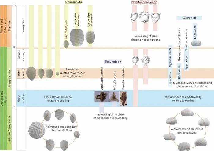 通过对我国东北松辽盆地和山东胶莱盆地湖相化石的研究,发现白垩纪/古近纪之交,轮藻植物群多样性变化与全球气候变化之间的关系密切。在坎潘期/马斯特里赫特期界限事件中,全球温度降低,松辽盆地的大气温度下降至16度(根据钙质结核团簇同位素测得),此时,轮藻植物群多样性降低(胶莱盆地的轮藻植物群也发生了类似的变化),孢粉植物群中的冷水分子由北方向松辽盆地扩散。在马斯特里赫特期中期的变暖事件中,松辽盆地轮藻、介形类成种作用明显,胶莱盆地的轮藻植物群多样性增高。