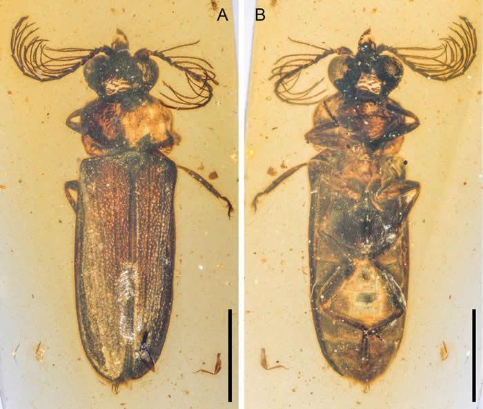 (化石网整理)据EurekAlert!:生物发光现象广泛地存在于各类生物中。在陆生动物中,能进行生物发光的物种大多数都属于鞘翅目昆虫(俗称甲虫),而其中又以叩甲总科(萤火虫及其近亲)的物种最多。大部分发光的叩甲总科的物种都属于“萤类”(lampyroid),包括萤科(Lampyridae)、光萤科(Phengodidae)、雌光萤科(Rhagophthalmidae),以及一个于2020年新建立的华光叩甲科(Sinopyrophoridae)。在这一分支中,除最基部的华光叩甲科外,萤科、光萤科与雌光萤科的身体均较为柔软,部分类群的雌性还具有幼态持续现象,这使得这一类群的物种很难保存为化石。除萤科于白垩纪缅甸琥珀及一些新生代地层中有化石记录外,其他类群此前尚没有化石被正式报道。